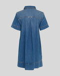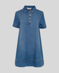 Robe en jean à manches courtes, longueur midi, col classique et fermeture boutonnée à l'encolure.